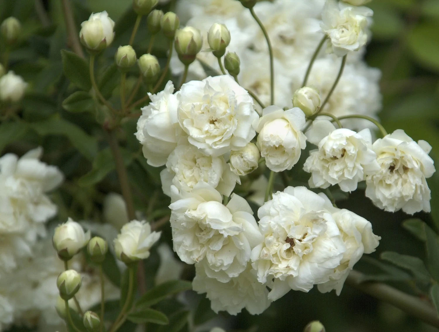 A vigorous climber with rich green foliage on nearly thorn-free slender branches. Lightly fragrant, miniature, white, double blooms are quite profuse. Bursts into bloom in spring to early summer; does not repeat bloom. Evergreen in milder climates. A fine climber for arbors.